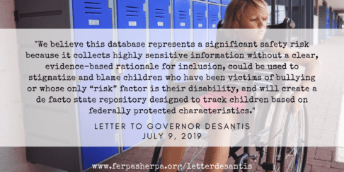 While this database indicates the Florida legislature’s and the governor’s desire to prevent another mass shooting, we believe the database represents a significant safety risk because it collects highly sensitive information without a clear, evidence-based rationale for inclusion; could be used to stigmatize and blame children who have been victims of bullying or whose only “risk” factor is their disability; and will create a de facto state repository designed to track children based on federally protected characteristics. Signatories to the letter include the ACLU, the American Association of People with Disabilities, the Bazelon Center for Mental Health Law, Common Sense Media, the Florida Council of Administrators of Special Education, the Learning Disabilities Association of America, the School Social Work Association of America, and other prominent organizations (see full list below).