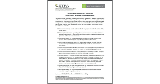 Technology services agreements entered into, amended, or renewed by a local education agency on or after January 1, 2015 must include specific requirements. These requirements apply to contracts for services that utilize electronic technology, including cloud-based services, for the digital storage, management and retrieval of pupil records, as well as educational software that authorizes a third party provider to access, store, and use pupil records. All of the following requirements laid out in this document must be included in such contracts.
