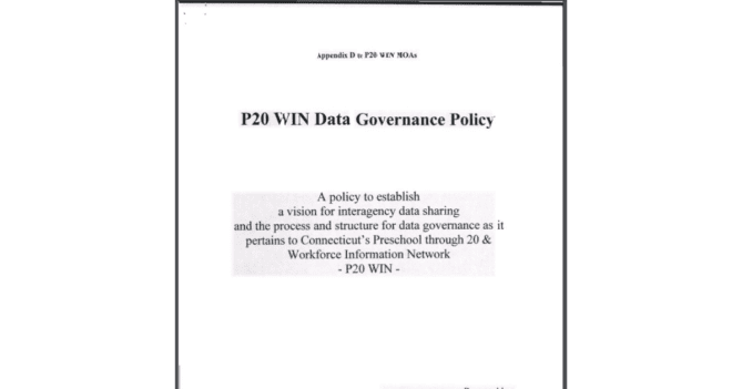 This resource is a policy to establish a vision for interagency data sharing and the process and structure for data governance as it pertains to Connecticut’s Preschool through 20 & Workforce Information Network.